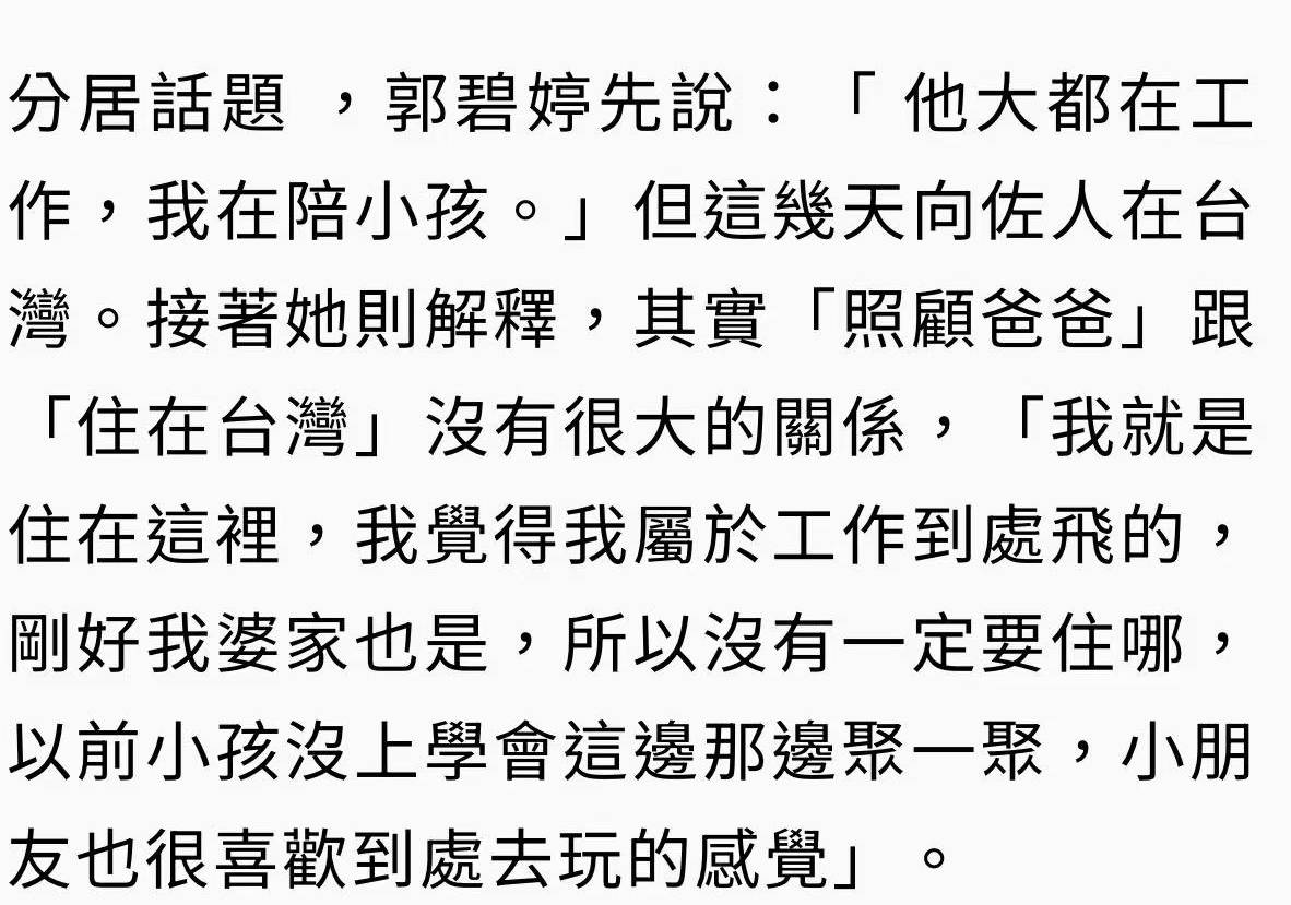 搬回台北,既照顾了生病的爸爸,又回到了自己熟悉的舒适区,掌握了生活的主动权;让向佐飞过来带娃,既解决了育儿问题,又避免了夫妻长期相处的矛盾;婆婆给的钱大大方方收下,不藏着掖着,反而显得坦荡。说到底,家家有本难念的经,豪门婚姻更是如此,但郭碧婷找到了属于自己的平衡之道。