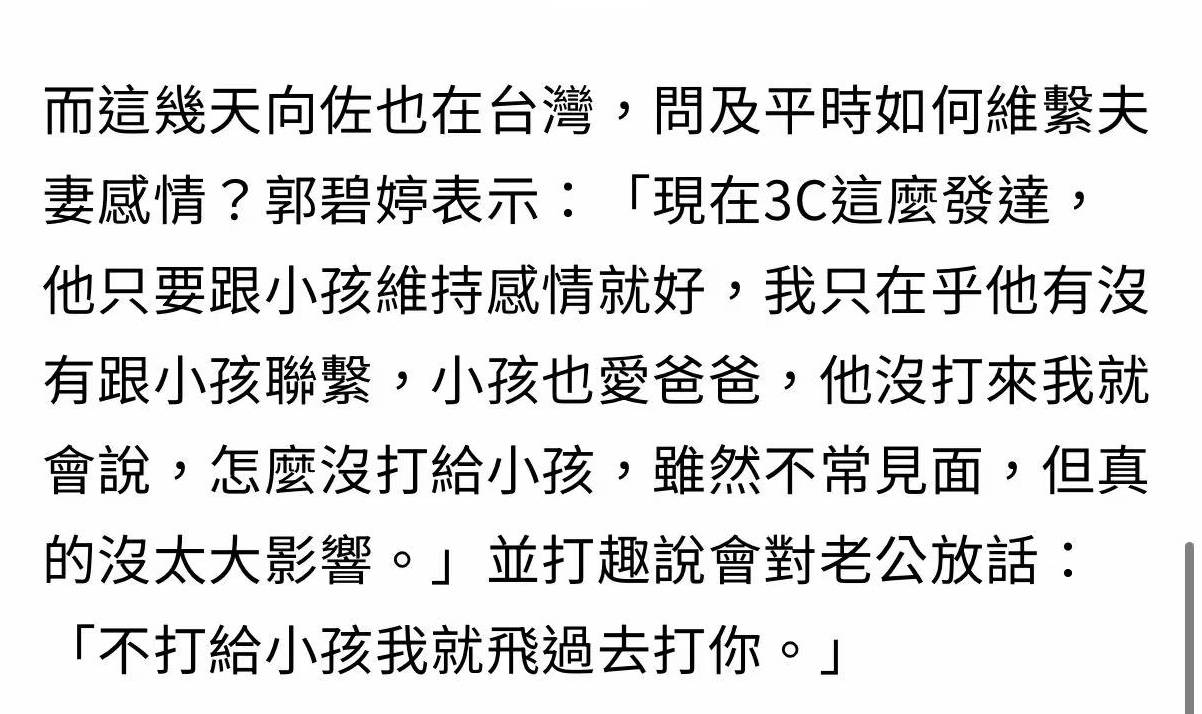 “我工作的时候,他就全权负责带孩子,会给孩子做早餐、送上学,还学会了扎辫子呢。” 郭碧婷说这话时,眼里带着笑意。要知道,在大家的印象里,豪门公子大多是养尊处优的,向佐居然愿意飞到台北全职带娃,夫妻俩每天通电话聊孩子,这种 “异地协作育儿” 模式,在豪门里确实少见。